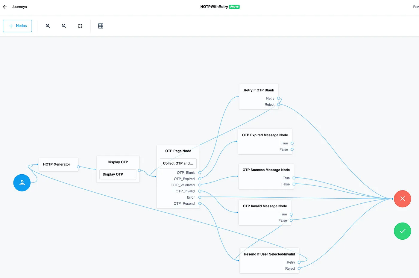 The following steps will configure a sample journey which generates a HOTP and then allows the user to either verify the OTP or re-send the OTP.